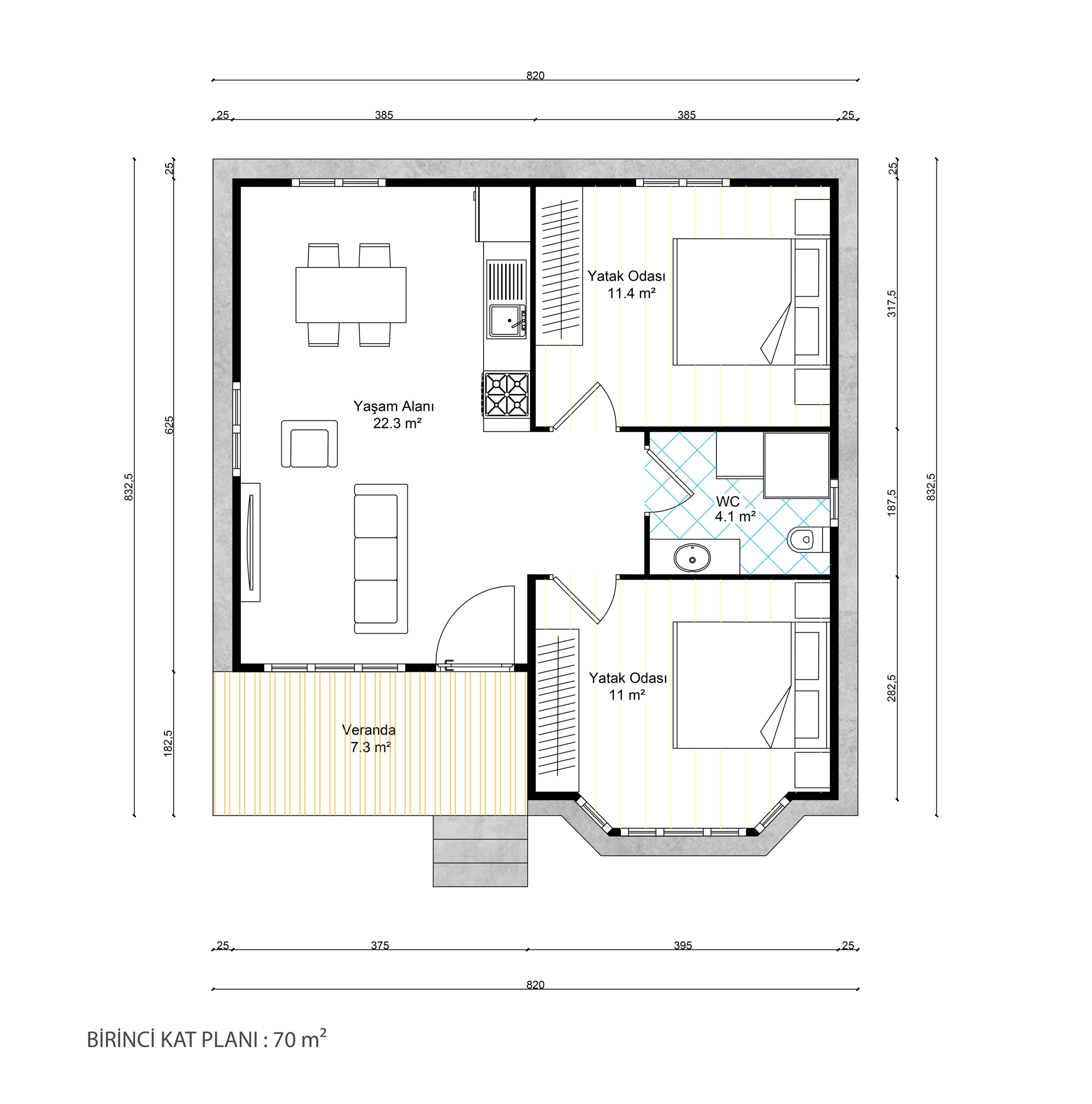 70 m² tek kat prefabrik ev, kompakt ve modern tasarımıyla hem şehir yaşamı hem de kırsal alanlar için ideal bir konut seçeneğidir. İki yatak odası, geniş yaşam alanı ve kullanışlı veranda ile aileler için konforlu bir yaşam sunar. Dayanıklı yapısı sayesinde uzun ömürlü, depreme dayanıklı ve enerji verimliliği yüksek bir çözümdür. Hızlı montaj avantajı ile kısa sürede oturuma hazır hale gelir.