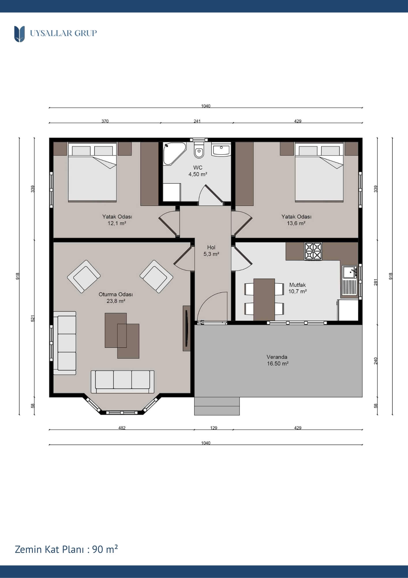 İç yerleşimde iki yatak odası, geniş bir oturma odası, işlevsel bir mutfak ve kullanışlı bir banyo bulunur. 90 m²’lik kullanım alanı, aile yaşamına uygun şekilde tasarlanmıştır. Ayrıca 16,5 m² büyüklüğündeki veranda, açık havada keyifli zaman geçirmek için mükemmel bir alan sunar.