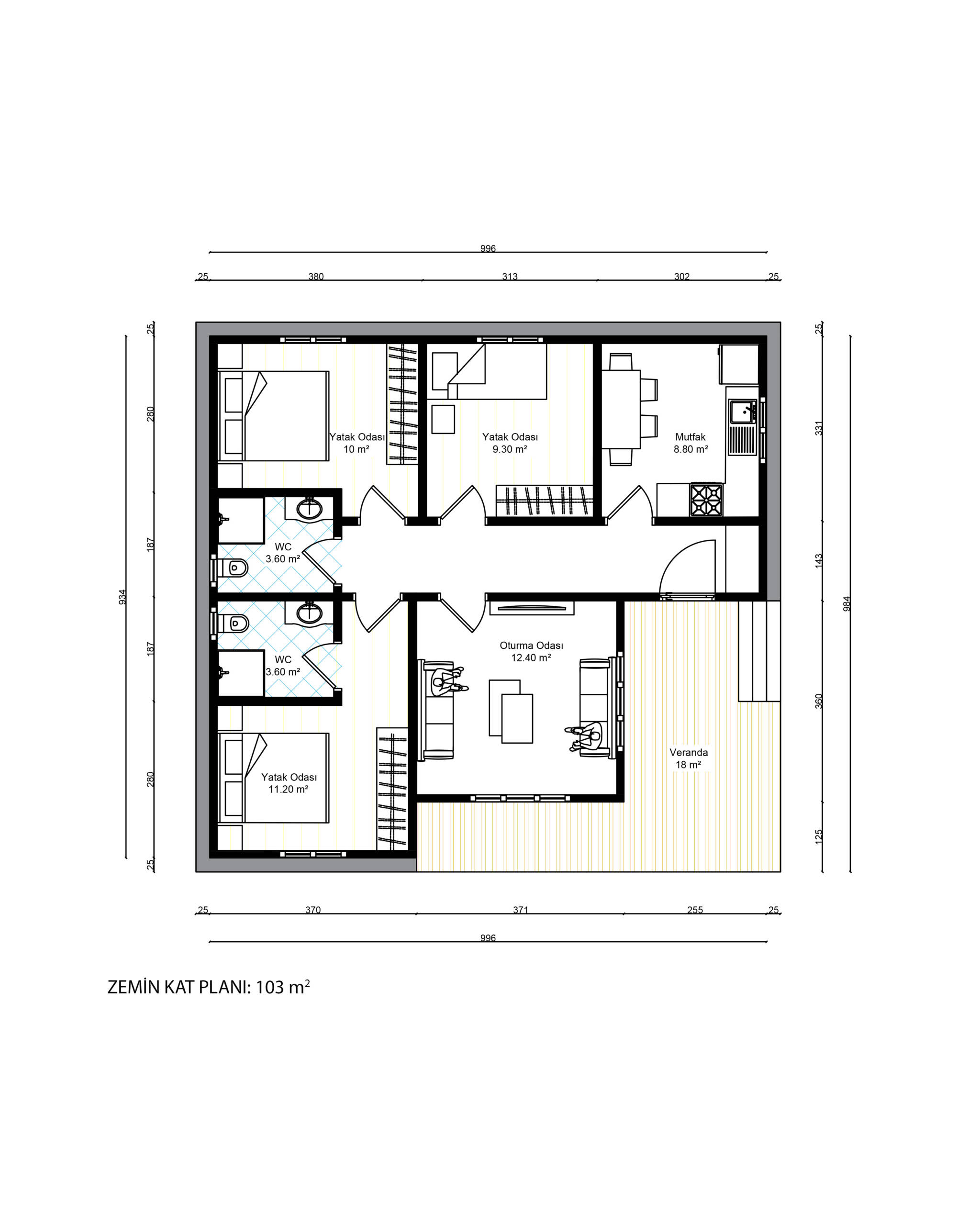 103 m² tek kat çelik ev, modern tasarımı ve kullanışlı planıyla şehir içi veya kırsal yaşam için ideal bir çözümdür. Çelik konstrüksiyon sistemi sayesinde uzun ömürlü, depreme dayanıklı ve enerji verimliliği yüksek bir yapı sunar. Geniş veranda, ferah yaşam alanı ve üç yatak odası ile aileler için konforlu bir yaşam imkanı sağlar. Hızlı montajı ve düşük bakım maliyeti ile pratik bir konut çözümüdür.