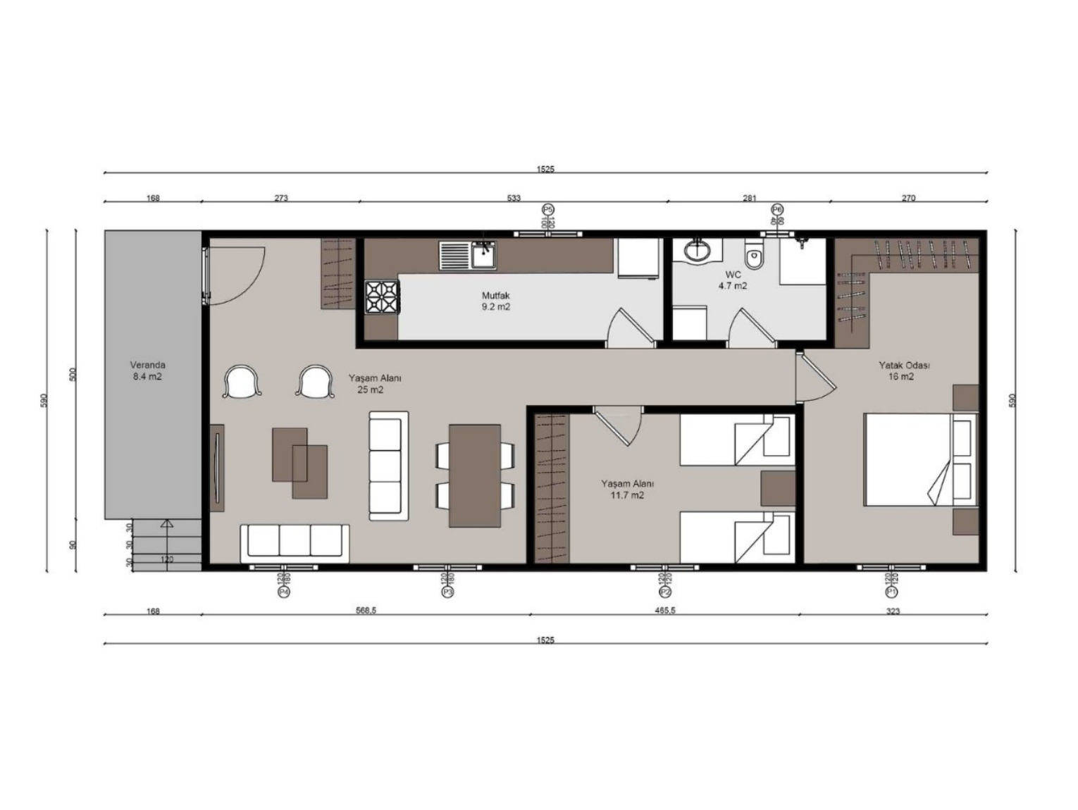 Toplam 90 m² kullanım alanına sahip olan bu çelik ev, fonksiyonel bir 2+1 plan düzenine sahiptir. Yapının merkezinde yer alan geniş yaşam alanı, birlikte yaklaşık 25 m² büyüklüğe sahiptir ve gün ışığını maksimum seviyede alacak biçimde konumlandırılmıştır. Bu alan, aile bireylerinin bir arada vakit geçirebileceği ferah ve rahat bir ortam sunar. Yaklaşık 9,2 m² olarak planlanmış, hem kullanım kolaylığı hem de alan verimliliği sağlanmıştır.