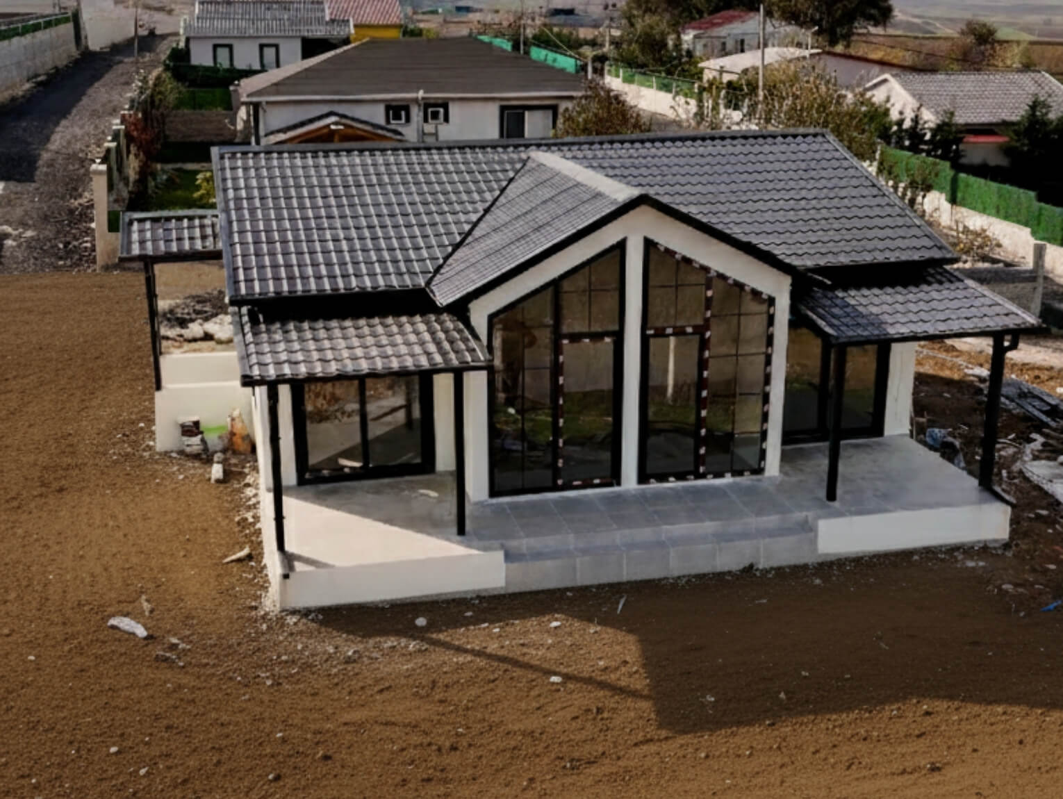 Mimari açıdan projede modern ve sade bir yaklaşım benimsenmiştir. Ön cephede kullanılan geniş cam yüzeyler, gün ışığının iç mekâna maksimum seviyede girmesini sağlar. Yüksek tavan hissi oluşturan cephe tasarımı, yaşam alanlarını olduğundan daha geniş ve ferah gösterir. Çatı formu ve dış cephe kaplamaları, hem estetik bütünlük hem de uzun ömürlü kullanım hedeflenerek seçilmiştir.