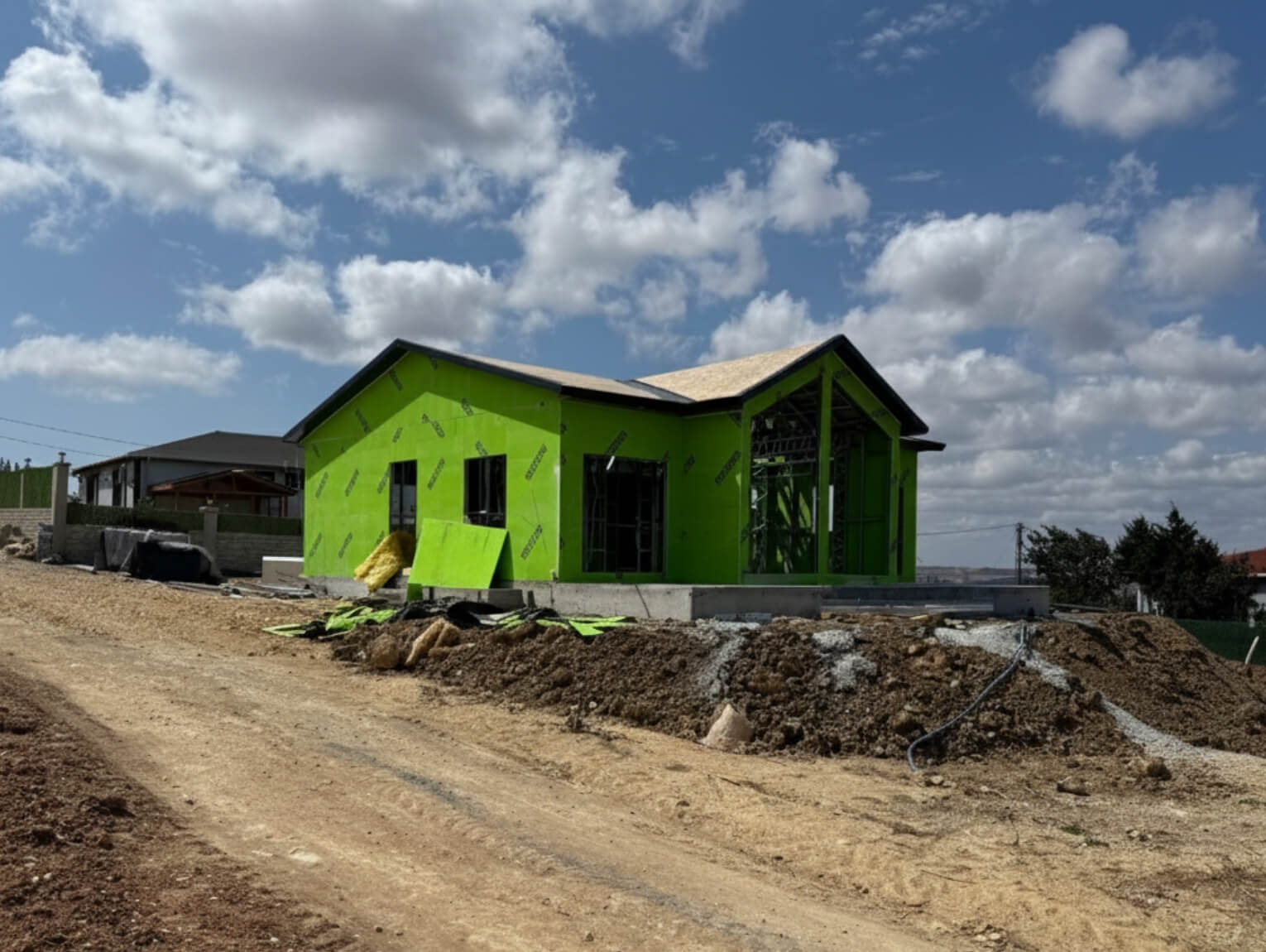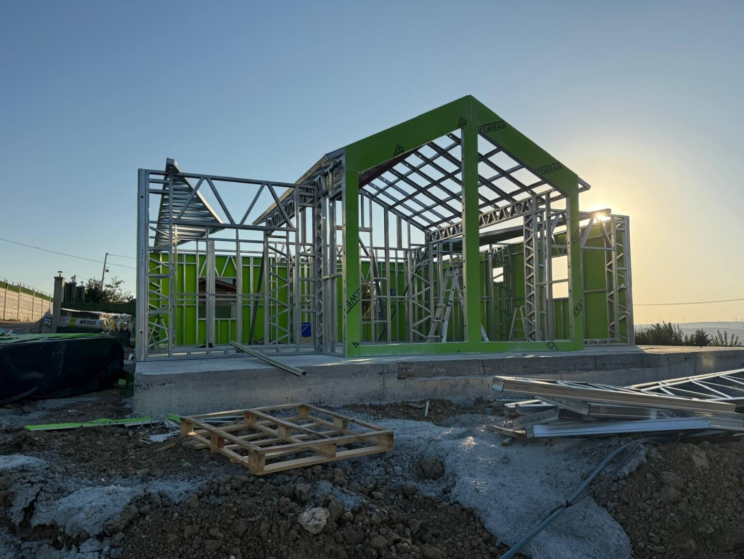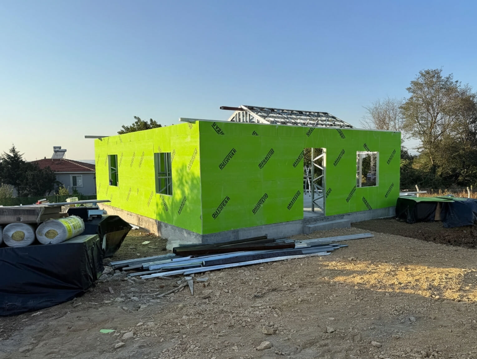 Yapım sürecinde çelik konstrüksiyonun sunduğu avantajlar net şekilde hissedilmiştir. Üretimin büyük kısmı kontrollü ortamda gerçekleştirilmiş, sahadaki montaj süreci hızlı ve planlı bir şekilde ilerlemiştir. Bu sayede hava koşullarından bağımsız, zaman kaybı yaşanmadan yapı kısa sürede tamamlanmıştır. Çelik ev sistemleri, hem işçilik kalitesini artırır hem de teslim süresini ciddi ölçüde kısaltır.