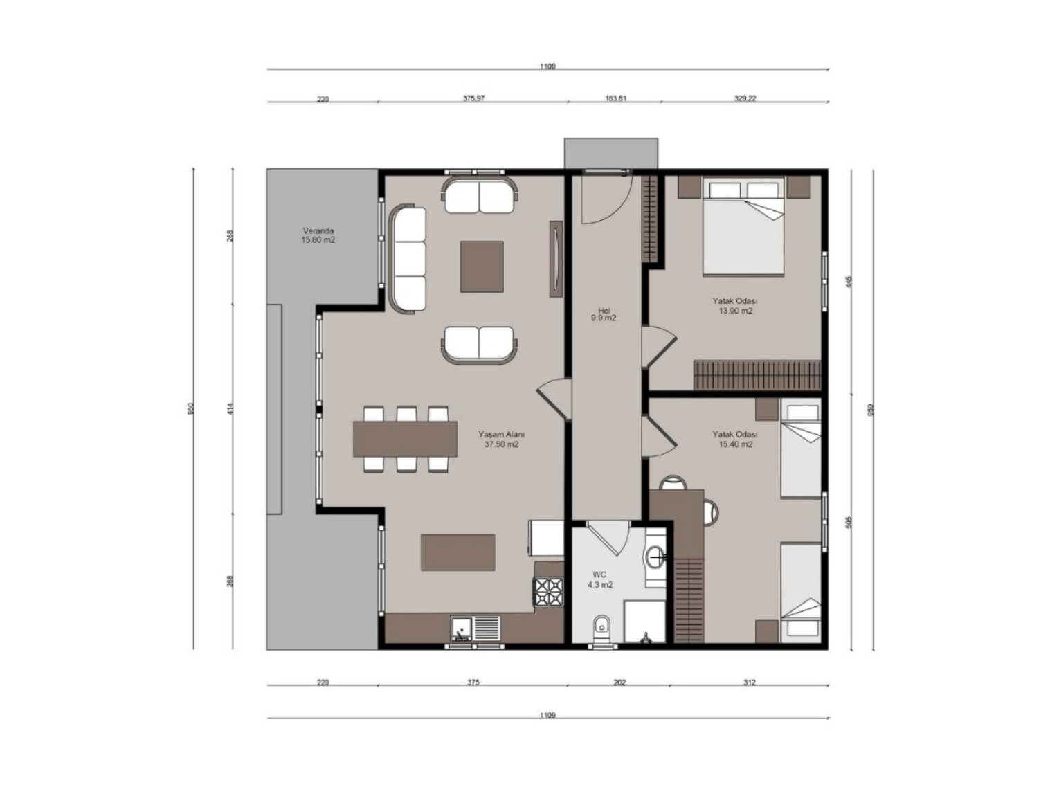 Projede yer alan 15,8 m² veranda, Çatalca’nın doğal atmosferini ev yaşamına dahil eden önemli bir detaydır. Veranda sayesinde açık alan kullanımı artar ve özellikle bahar ve yaz aylarında evin yaşam alanı dış mekâna doğru genişler.