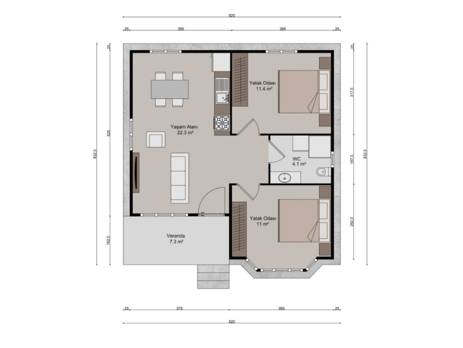 70 m² büyüklüğündeki bu prefabrik ev, 2+1 plan tipine sahiptir. Açık mutfak ile birleşen yaşam alanı yaklaşık 22,3 m² olarak planlanmış ve gün ışığını en verimli şekilde alacak biçimde konumlandırılmıştır. Bu alan, hem oturma hem de yemek bölümü olarak rahat bir kullanım imkânı sunar. İki ayrı yatak odası, aile bireylerinin konforu düşünülerek dengeli ölçülerde tasarlanmıştır. Birinci yatak odası 11,4 m², ikinci yatak odası ise 11 m² büyüklüğündedir. Ortak kullanım için planlanan banyo ve WC alanı ise 4,1 m² olarak çözümlenmiştir.